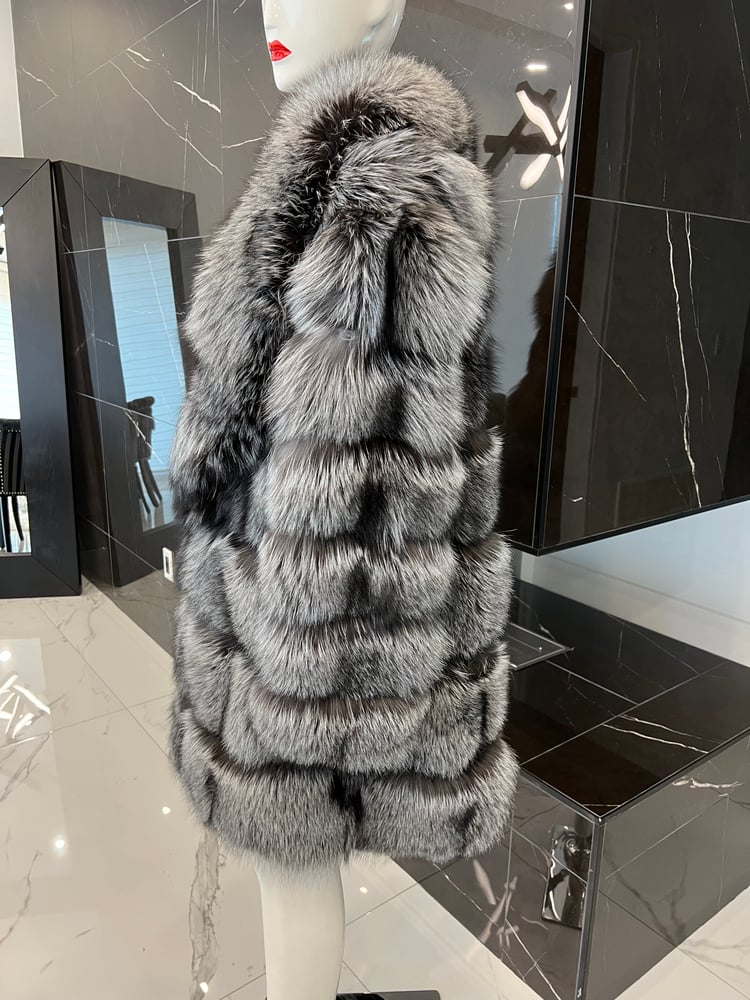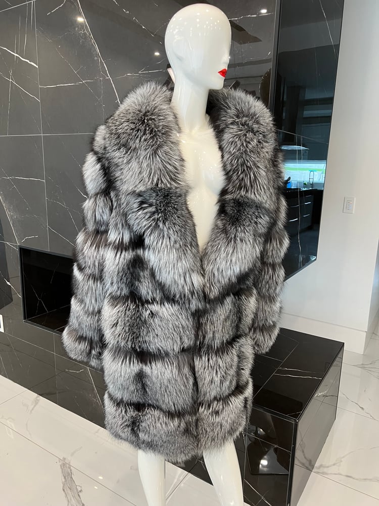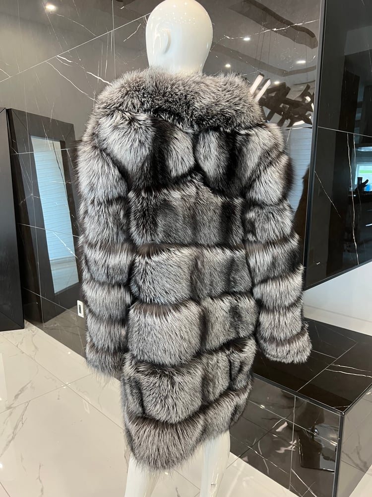 Genuine silver fox fur coat made in our signature convertible style. Detachable sleeves and a detachable waist.